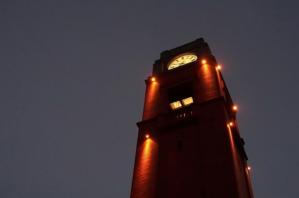 Na dziedzińcu Mariusz robi zdjęcie Wieży Zegarowej