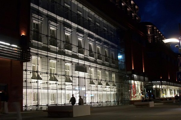 Fantastyczna imitacja kamienicy: za szklaną ścianą, wspartą na wymyślnej metalowo-linowej konstrukcji, jest kolejna ściana, ''udająca'' niezwykłą, białą kamienicę (za tą ścianą jest część ''Starego Browaru'')