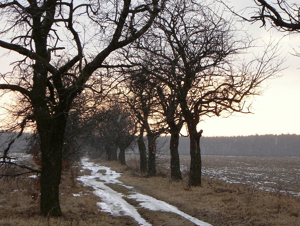 Polna droga nieopodal - w śniegu i świetle zachodzącego słońca
