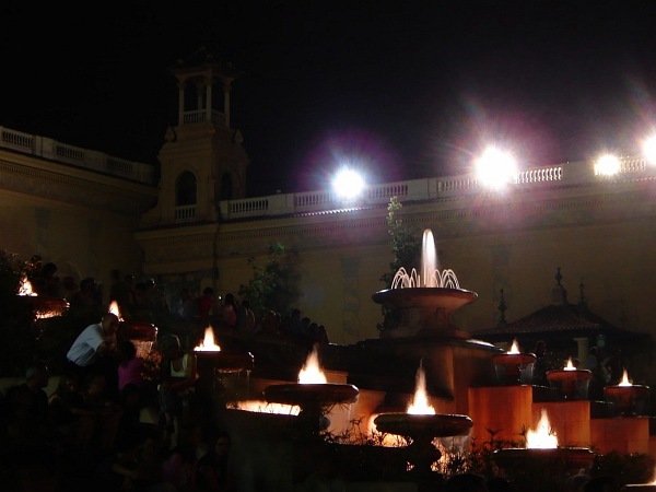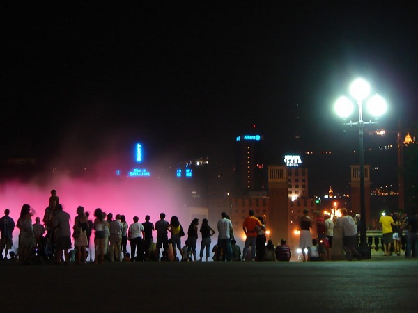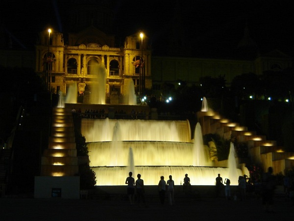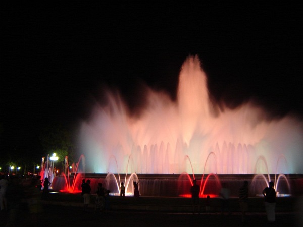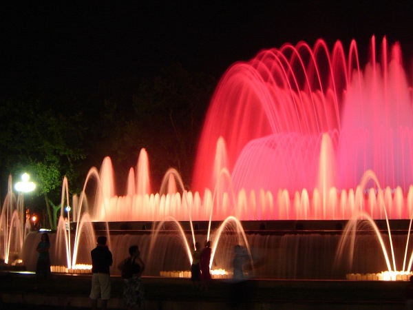 No i stało się. Miałem półtorej godziny zapasu, ale pomyliłem autostrady i do Barcelony dojechałem nie od tej strony co trzeba. Skutek: przy okienku odprawy zameldowałem się pięć minut po "boarding time" (czyli po czasie, kiedy powinienem wchodzić już do samolotu; a od odprawy do wejścia do samolotu jest jeszcze dłuuuuuga droga). To oznaczało, że musiałem poprosić sympatyczną panią linii Lufthansa o znalezienie następnego samolotu do Poznania lub Warszawy. Znalazła, ale dopiero na drugi dzień. Więc zapakowałem bagaże do autobusu kursującego między lotniskiem a centrum Barcelony i pojechałem do hotelu Dzięki temu spóźnieniu miałem okazję zobaczyć w Barcelonie jeszcze to, czego nie widziałem kilka dni wcześniej: Plac Katalonii w ciekawym wieczornym oświetleniu... ... i prawdziwy balet fontann... ... podziwiany przez tłumy mimo późnej pory (w pół do dwunastej w nocy) Podnóże barcelońskiego zamku to istne królestwo tysięcy chyba fontann A to tuż przed wejściem do hotelu - ulica Diagonalna w środku nocy, z charakterystyczną latarnią Gaudi'ego (o ile dobrze pamiętam) |