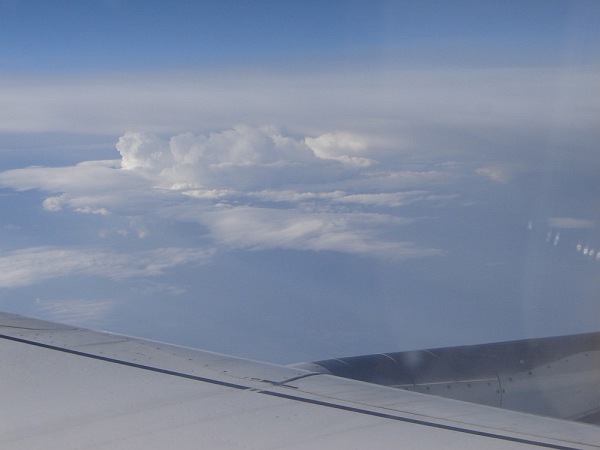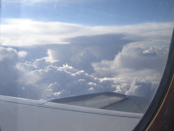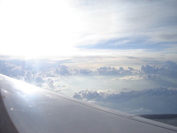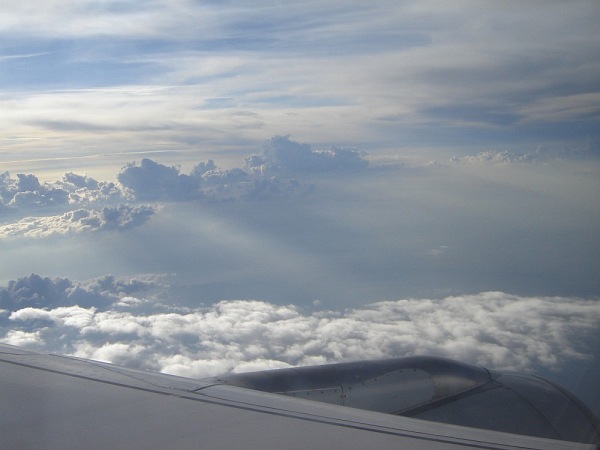 Na lotnisku w Barcelonie (już po odprawie), w poszukiwaniu właściwej "bramy", skąd odlatywał samolot do Monachium Krótko po starcie z lotniska w Barcelonie (samolot wykonuje łuk, aby obrać właściwy kierunek). Niesamowite było to, że niebieskość morza była dokładnie taka sama, jak nieba - w efekcie samolot jakby zawisł w niebieskiej przestrzeni, pozbawionej linii horyzontu, porządkującej - jakby nie było - obraz w normalnych warunkach Natomiast były chmury - cudowne chmury, kreujące nowy świat tam na górze: świat z własnymi jeziorami, morzami, górami, przepaściami... I to im poświęcam niniejszy album Małe wtrącenie: w pewnej chwili światło słoneczne padało pod takim kątem, że zauważyłem otworek w szybce i dziwne drobinki wokół. Wiem, że to efekt normalnej technologii, ale przez moment oczami wyobraźni zobaczyłem pękającą w tym miejscu szybę i siebie wyssanego przez tak powstały otwór. Ale przepiękne widoki za oknem sprawiły, że szybko zapomniałem o tym "otworku" Krótko przed lądowaniem. Ta jaśniejsza plama na dole to -sądzę - Jezioro Bodeńskie |