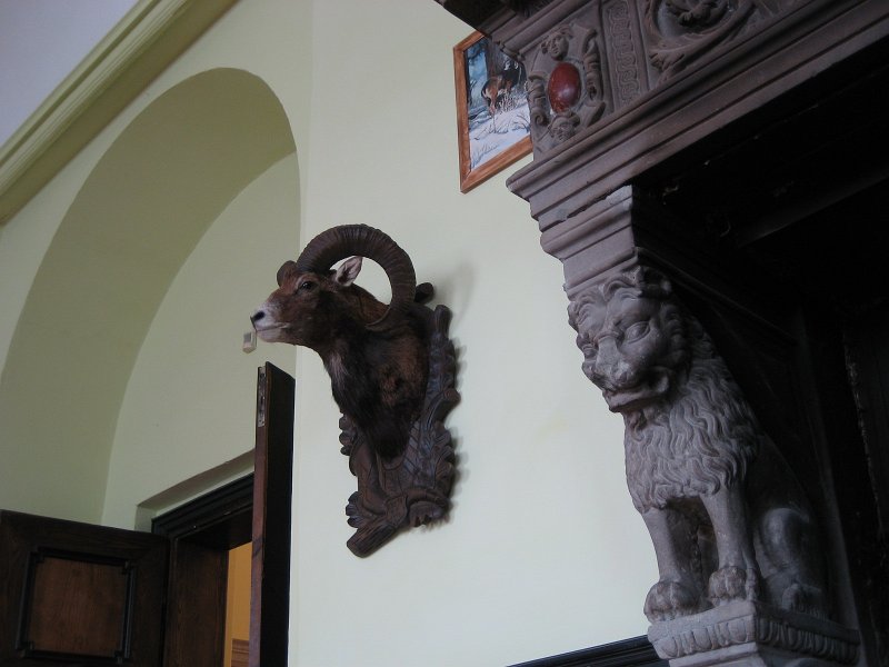 | Muflon (odmiana dzikich owiec, sprowadzona do Polski z Hiszpanii). Legenda głosi, że z czasem jego rogi tak się zawijają, że przebijają mózg. Patrząc na ten okaz, trudno w to nie uwierzyć... | |