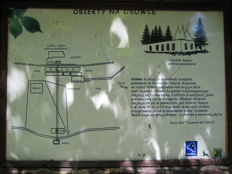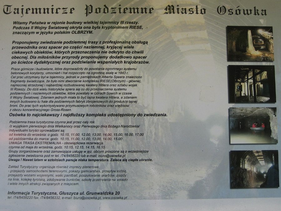 Wejście do kompleksu podziemnych korytarzy i hal "Osówka". Podziemne Miasto Osówka to prawdopodobnie część ogromnego systemu korytarzy, umocnień i hal RIESE (Olbrzym), budowanego przez Niemców pod Górami Sowimi od 1943 do 1945 roku (nieukończonego z powodu wyzwolenia tych ziem w 1945 roku). Wygląda na to, że do dziś znamy jedynie mniejszą część tego systemu. Reszta, jak również jego przeznaczenie (kwatera Hitlera i jego wojsk? depozyt skarbów zrabowanych z terenów okupowanych przez Niemców? podziemne laboratoria i fabryki tajnych nowych broni?) nie jest znane do dzisiaj...