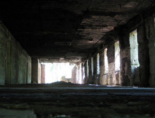 Ta jasno oświetlona hala betonowa w tle to hala awaryjnych agregatów (wentylatorów i generatorów, których zadaniem miało być zapewnienie odpowiedniej wentylacji i energii w przypadku awarii głównych maszyn). Sklepienie hali (nie tylko tej) jest lekko łukowe: to dlatego, aby - gdyby pękła np. rura wodna nad sklepieniem - woda spływała ku ścianom, tam - otworami w suficie - po ścianach do kanałów ściekowych przy ścianach, potem studzienkami do głównego systemu ściekowego