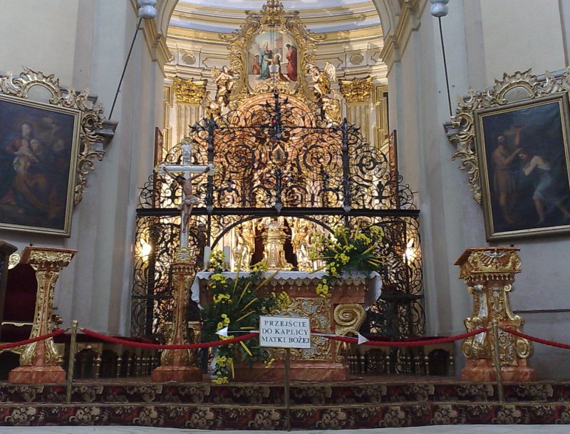 Boczny ołtarz i bogato zdobiona ambona. W bazylice nie wolno było używać lampy błyskowej - zapewne w trosce o kondycję cudownych zabytków i obrazów. Pragnę zapewnić, że wszystkie zdjęcia zamieszczone w niniejszym albumie zostały zrobione bez lampy błyskowej