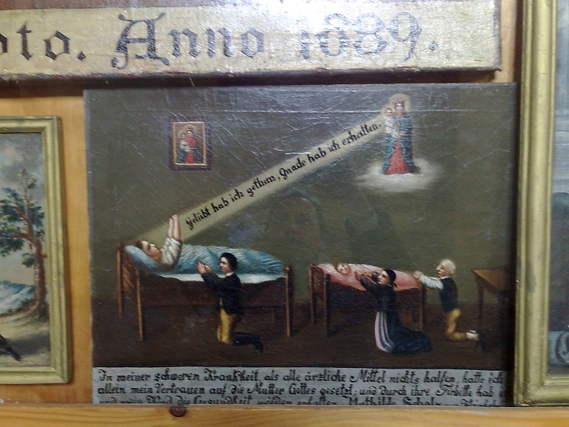 Jeden z wielu obrazów, upamiętniający cudowne ozdrowienie ciężko chorego człowieka w obliczu "Wambierzyckiej Królowej Rodzin" |