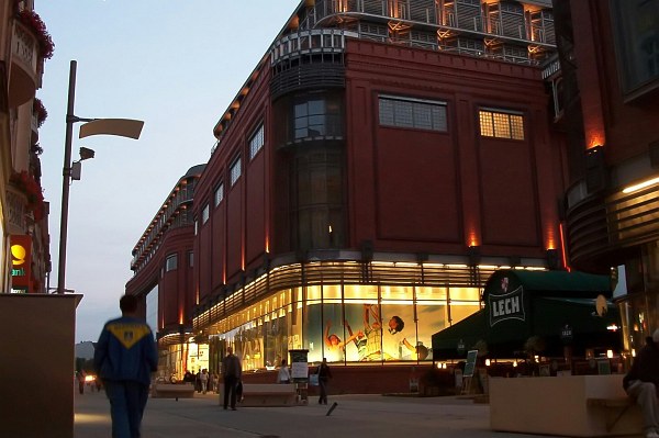 Fantastyczna imitacja kamienicy: za szklaną ścianą, wspartą na wymyślnej metalowo-linowej konstrukcji, jest kolejna ściana, ''udająca'' niezwykłą, białą kamienicę (za tą ścianą jest część ''Starego Browaru'')