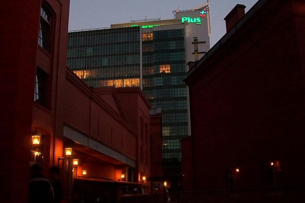 Widok z dziedzińca na dachu ''Starego Browaru'' na stojący po sąsiedzku biurowiec PFC