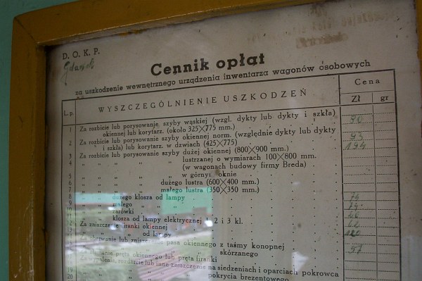 Ciekawostka: wszelkie możliwe akty wandalizmu zostały skatalogowane i wycenione (niestety nie udało mi się odszyfrować, z którego roku pochodzi ta kartka, wisząca w jednym z wagonów osobowych, przeznaczonych do zwiedzania)