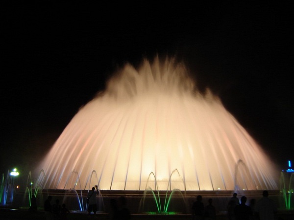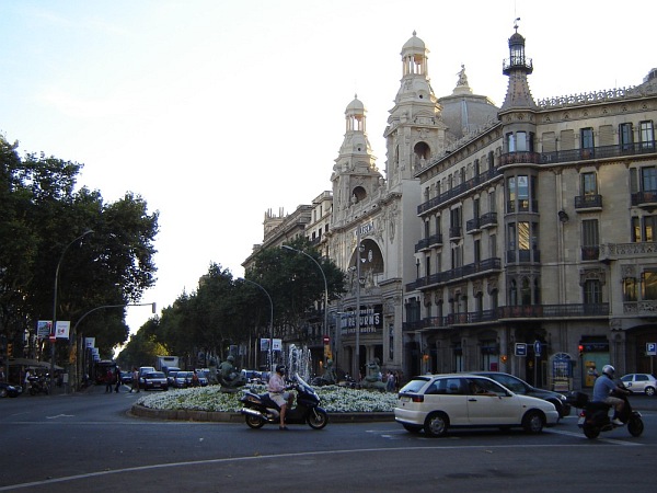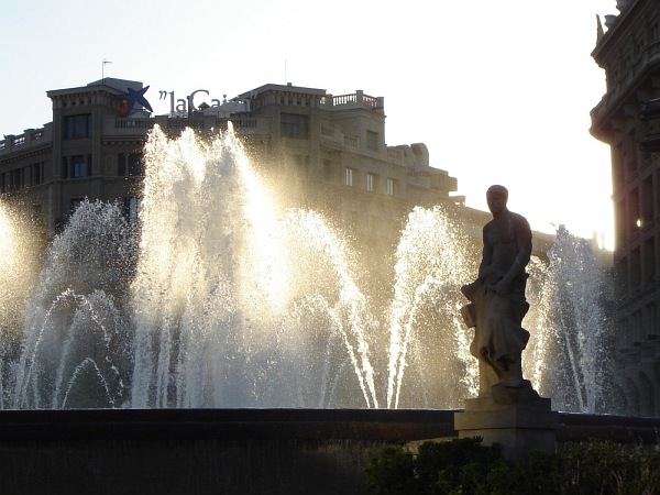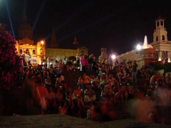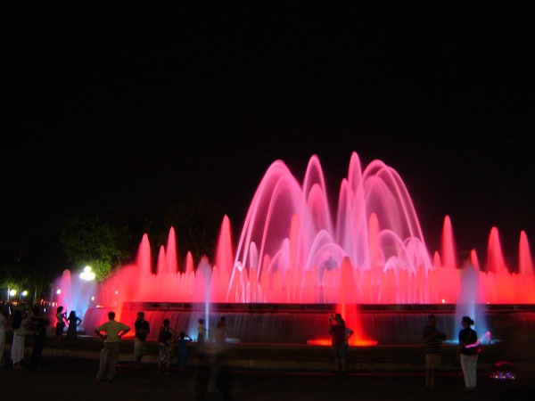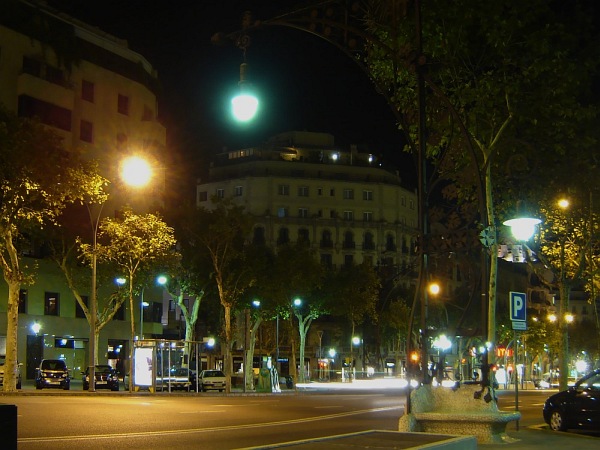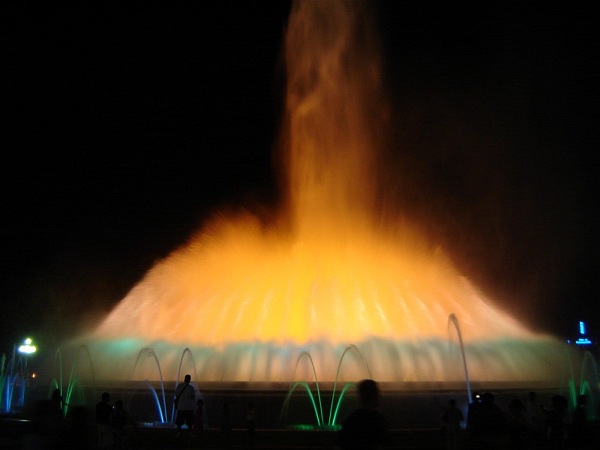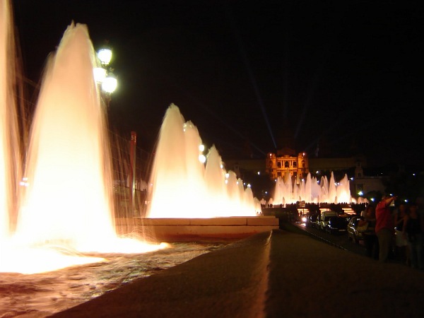 No i stało się. Miałem półtorej godziny zapasu, ale pomyliłem autostrady i do Barcelony dojechałem nie od tej strony co trzeba. Skutek: przy okienku odprawy zameldowałem się pięć minut po "boarding time" (czyli po czasie, kiedy powinienem wchodzić już do samolotu; a od odprawy do wejścia do samolotu jest jeszcze dłuuuuuga droga). To oznaczało, że musiałem poprosić sympatyczną panią linii Lufthansa o znalezienie następnego samolotu do Poznania lub Warszawy. Znalazła, ale dopiero na drugi dzień. Więc zapakowałem bagaże do autobusu kursującego między lotniskiem a centrum Barcelony i pojechałem do hotelu Dzięki temu spóźnieniu miałem okazję zobaczyć w Barcelonie jeszcze to, czego nie widziałem kilka dni wcześniej: Plac Katalonii w ciekawym wieczornym oświetleniu... ... i prawdziwy balet fontann... ... podziwiany przez tłumy mimo późnej pory (w pół do dwunastej w nocy) Podnóże barcelońskiego zamku to istne królestwo tysięcy chyba fontann A to tuż przed wejściem do hotelu - ulica Diagonalna w środku nocy, z charakterystyczną latarnią Gaudi'ego (o ile dobrze pamiętam) |