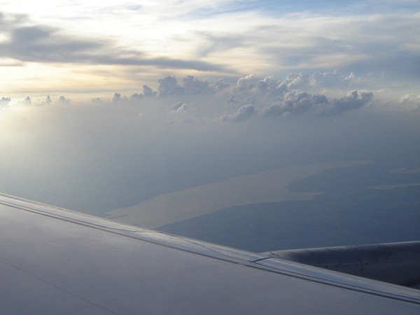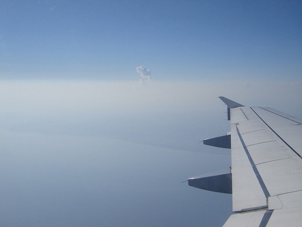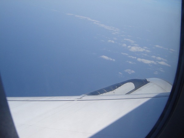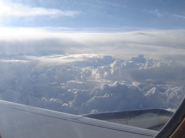 Na lotnisku w Barcelonie (już po odprawie), w poszukiwaniu właściwej "bramy", skąd odlatywał samolot do Monachium Krótko po starcie z lotniska w Barcelonie (samolot wykonuje łuk, aby obrać właściwy kierunek). Niesamowite było to, że niebieskość morza była dokładnie taka sama, jak nieba - w efekcie samolot jakby zawisł w niebieskiej przestrzeni, pozbawionej linii horyzontu, porządkującej - jakby nie było - obraz w normalnych warunkach Natomiast były chmury - cudowne chmury, kreujące nowy świat tam na górze: świat z własnymi jeziorami, morzami, górami, przepaściami... I to im poświęcam niniejszy album Małe wtrącenie: w pewnej chwili światło słoneczne padało pod takim kątem, że zauważyłem otworek w szybce i dziwne drobinki wokół. Wiem, że to efekt normalnej technologii, ale przez moment oczami wyobraźni zobaczyłem pękającą w tym miejscu szybę i siebie wyssanego przez tak powstały otwór. Ale przepiękne widoki za oknem sprawiły, że szybko zapomniałem o tym "otworku" Krótko przed lądowaniem. Ta jaśniejsza plama na dole to -sądzę - Jezioro Bodeńskie |