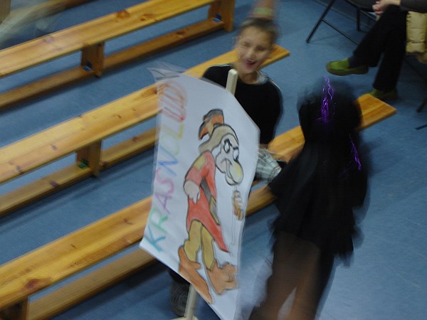 Może to dziwny zwyczaj, ale skądinąd sympatyczny: władze szkoły w Swarzędzu doszły doszły do wniosku, że nauczanie w klasach 4-6 jest na tyle różne od tego w klasach 1-3, że uczniowie, którzy przeszli do klasy 4, powinni ponownie zostać "otrzęsieni". Poniżej przedstawiam kilka zdjęć i "stopklatek" z tej uroczystości. Klasa Adasia nazwała siebie Krasnoludami. Adamowi przypadł w udziale zaszczyt wykonania plakatu. Zaczął rysować sam, ale doszedł do wniosku, że lepiej będzie, jeśli poszukamy jakiegoś rysuneczku w Internecie, wydrukujemy na kilkunastu kartkach i jak je potem sklei razem. Tak zrobiliśmy. Aby te sklejone pojedyncze kartki były sztywniejsze, nakleił je na ten karton, na którym zaczął wcześniej rysować "swojego" krasnala. Kiedy wyjmował go w klasie, wszyscy - zamiast zachwycić się krasnoludkiem wydrukowanym z Internetu, zachwycili się niedokończonym rysunkiem Adama. Dokończył go więc i oto efekt