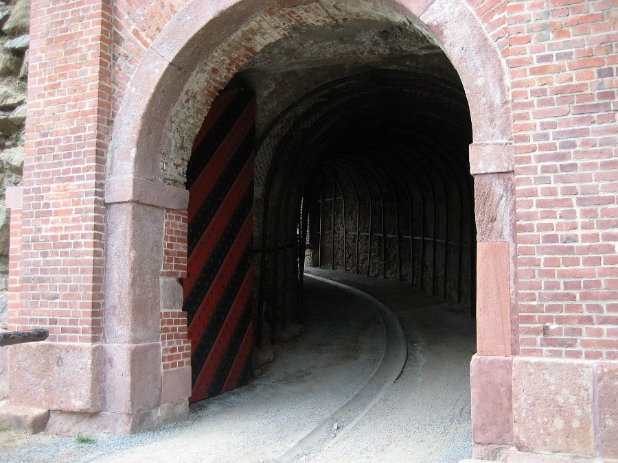 Wejście do głównego fortu. W razie oblężenia spuszczano z góry dwoje drzwi i między nie sypano przez specjalny otwór w suficie korytarza ziemię – w ten sposób skutecznie blokowano wejście do fortu, gdy przeciwnik sforsował zewnętrzne mury i już stał przed tym wejściem. W historii Twierdzy Srebrnogórskiej nigdy nie trzeba było się uciec do takich środków. Była co prawda oblegana (jeden raz) podczas wojny francusko-pruskiej w 1807 roku, ale wojska napoleońskie nie zdołały nawet dojść do tego miejsca