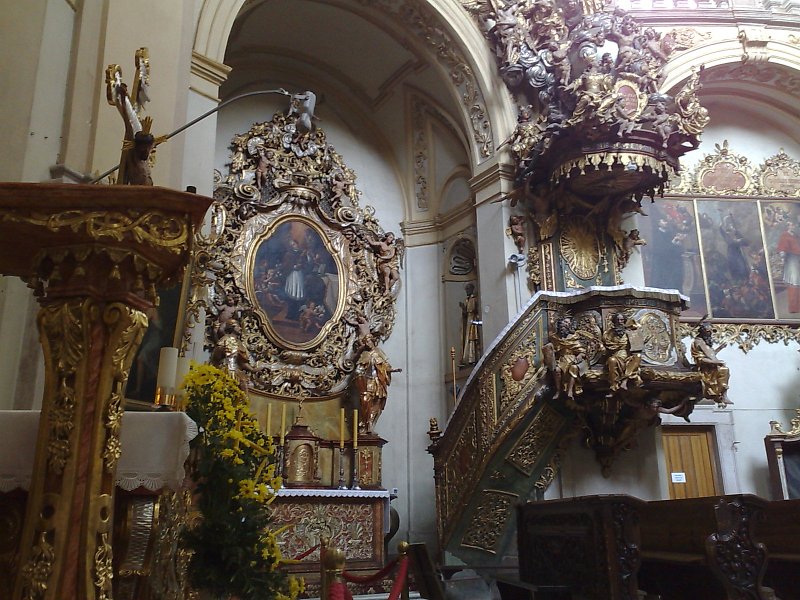 Boczny ołtarz i bogato zdobiona ambona. W bazylice nie wolno było używać lampy błyskowej - zapewne w trosce o kondycję cudownych zabytków i obrazów. Pragnę zapewnić, że wszystkie zdjęcia zamieszczone w niniejszym albumie zostały zrobione bez lampy błyskowej